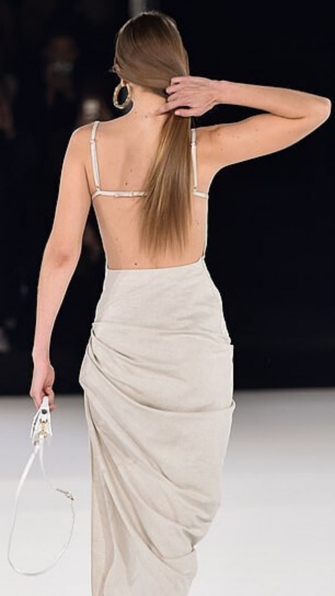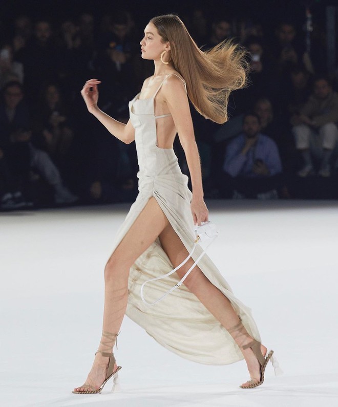 Tại tuần lễ thời trang Paris 2020, Gigi Hadid đã tạo ra một cơn bão khắp mạng xã hội với khoảnh khắc hất tóc khoe lưng váy khi đang catwalk trên đường băng. Chiếc váy dài bất đối xứng cô diện đến từ thương hiệu Jacquemus với phần hở lưng yêu kiều, giúp nàng It Girl khoe được vóc dáng cân đối, thon gọn.