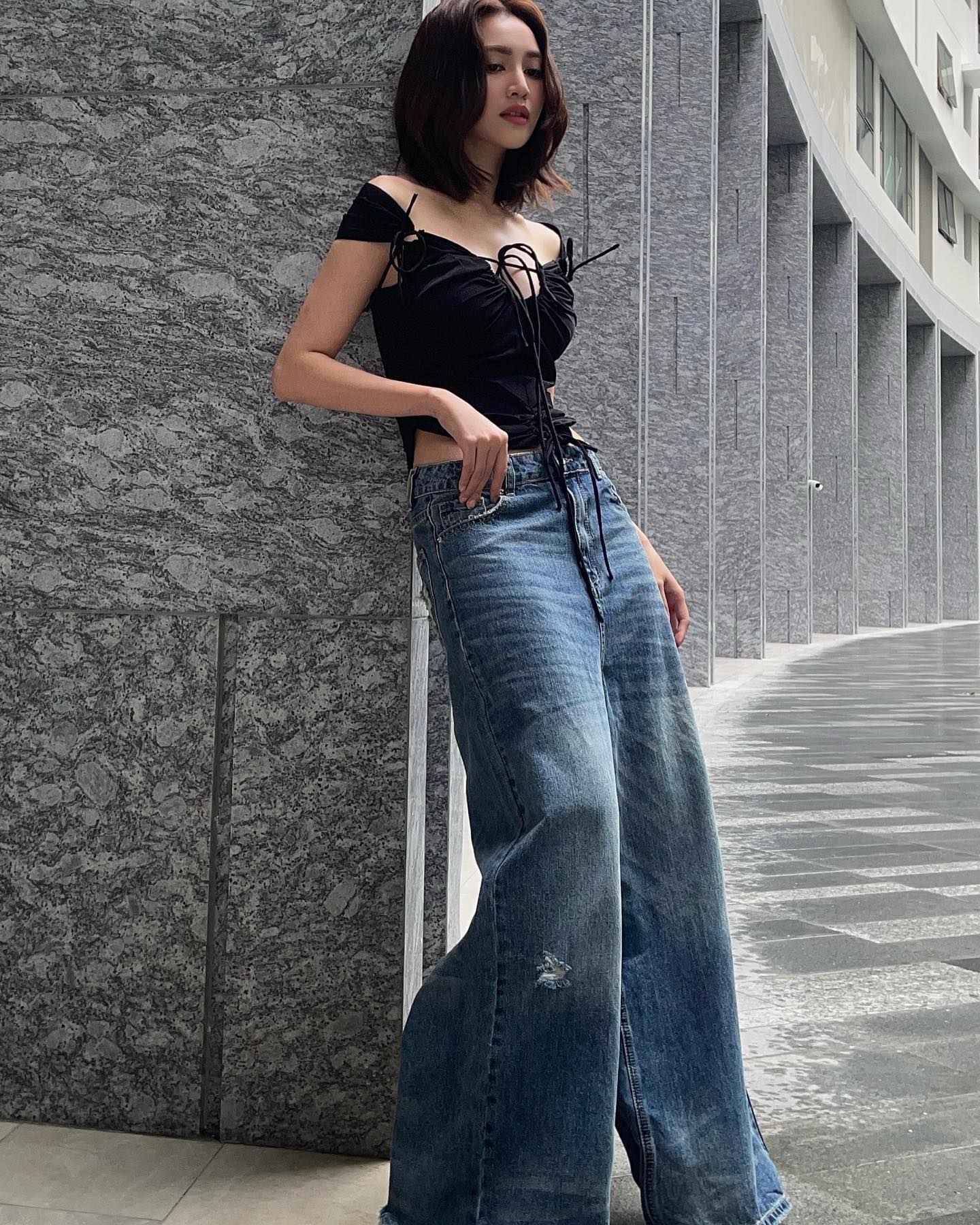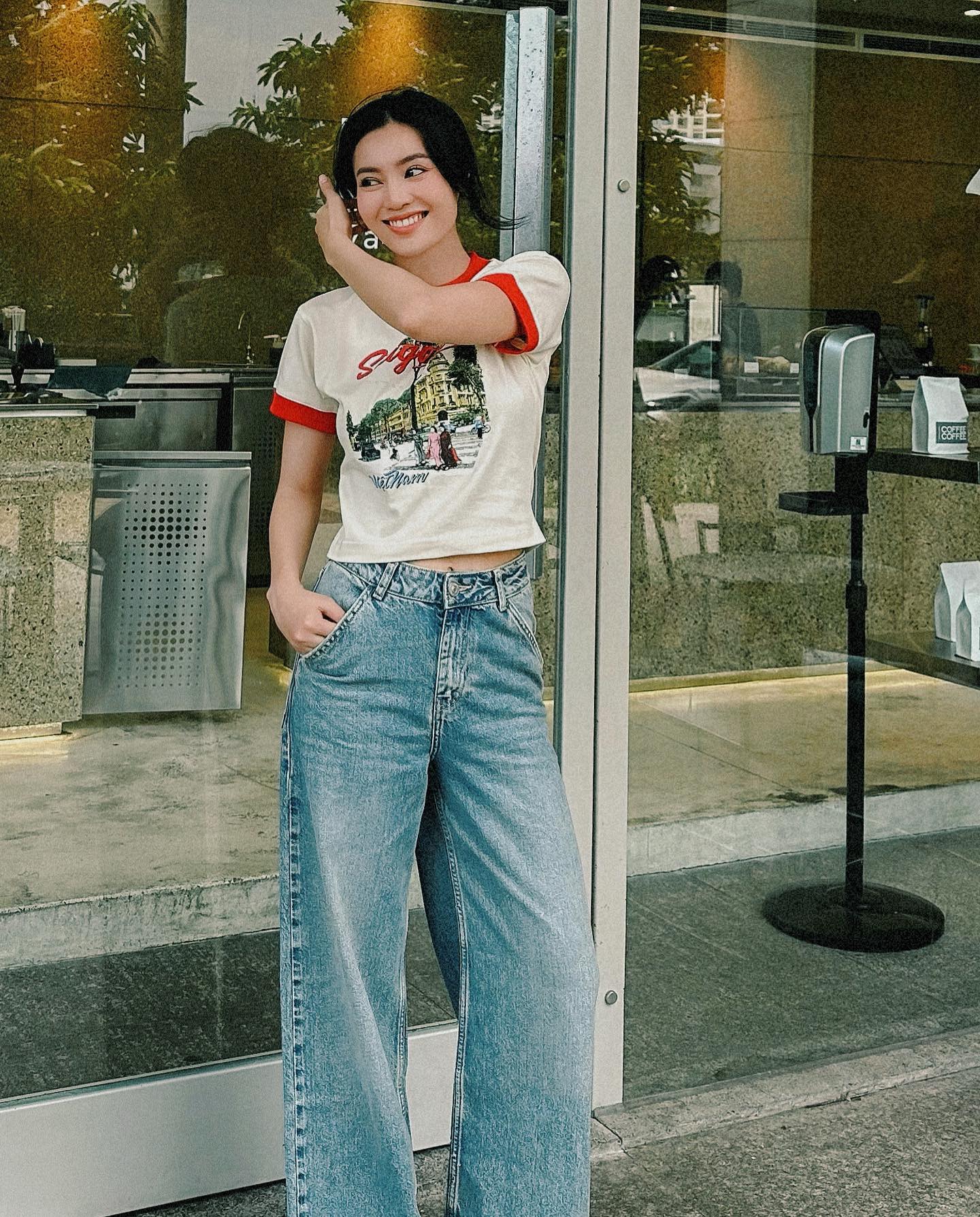 Không muốn diện đồ quá táo bạo, chị em hãy tham khảo outfit gồm áo thun lửng kết hợp với quần jeans ống suông của Ninh Dương Lan Ngọc. Bộ trang phục trên cho hiệu quả "hack" tuổi, đồng thời tôn dáng tối ưu. Các mẫu giày phù hợp để diện với outfit bao gồm giày sneaker trắng, sandal hoặc giày mule cao gót.