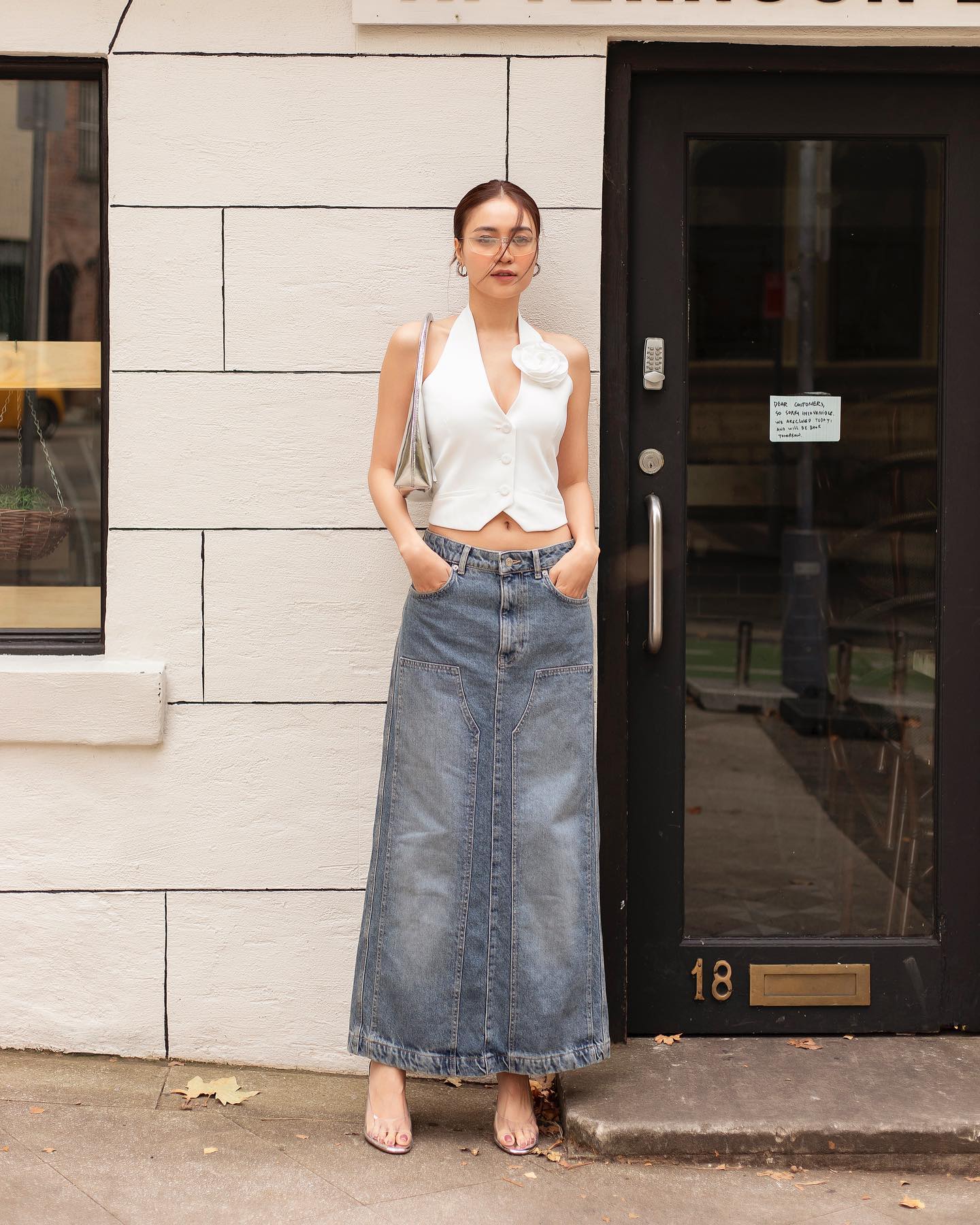 Chân váy denim dáng suông đang được rất nhiều mỹ nhân Việt chọn diện. Thay vì kết hợp mẫu chân váy bụi bặm này với áo thun năng động, Ninh Dương Lan Ngọc đã chọn áo gile nữ tính. Hiệu quả tôn dáng của tổng thể trang phục được phát huy tối ưu khi Ninh Dương Lan Ngọc đi sandal quai trong.