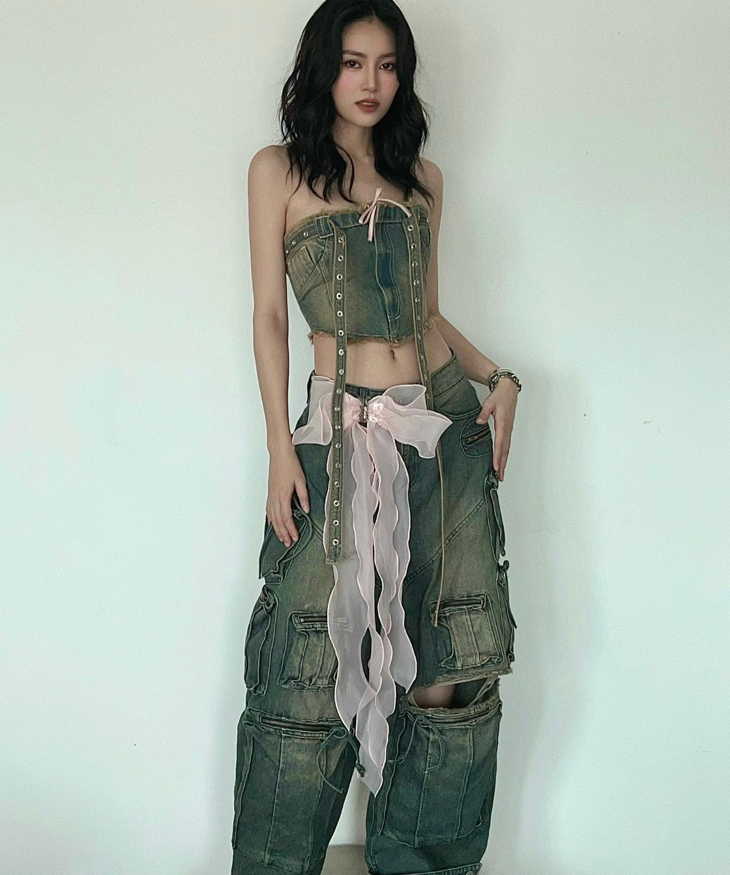 Diện set đồ denim phá cách, vẻ ngoài của Ninh Dương Lan Ngọc trông rất nổi bật và quyến rũ. Chi tiết nơ buộc cộng thêm điểm nữ tính, ngọt ngào cho bộ cánh mà không tạo cảm giác rối mắt. Vì set trang phục đã rất ấn tượng, Ninh Dương Lan Ngọc đã tối giản hóa phụ kiện. Nữ diễn viên còn gợi ý kiểu tóc lý tưởng để áp dụng, đó là tóc layer uốn sóng.