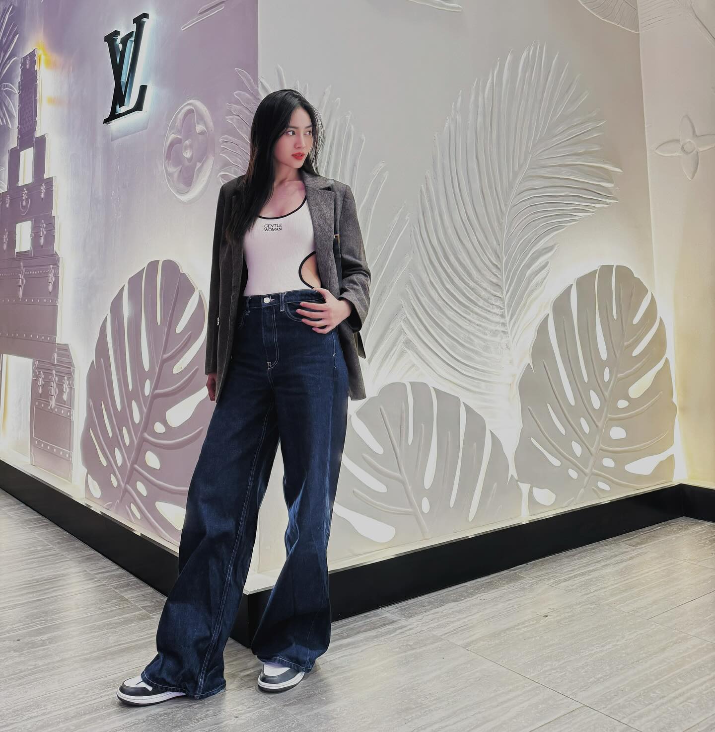 Dù không quá cầu kỳ, set đồ gồm áo khoét eo, quần jeans ống suông của Ninh Dương Lan Ngọc vẫn rất ấn tượng. Cô đã cộng thêm điểm thanh lịch cho outfit bằng cách khoác ngoài áo blazer. Đôi sneaker ăn nhập hoàn hảo với bộ cánh thời thượng.