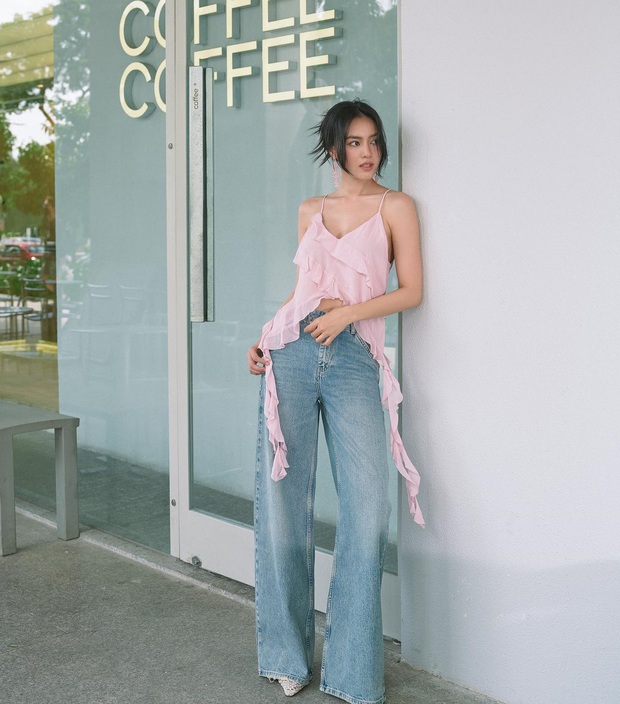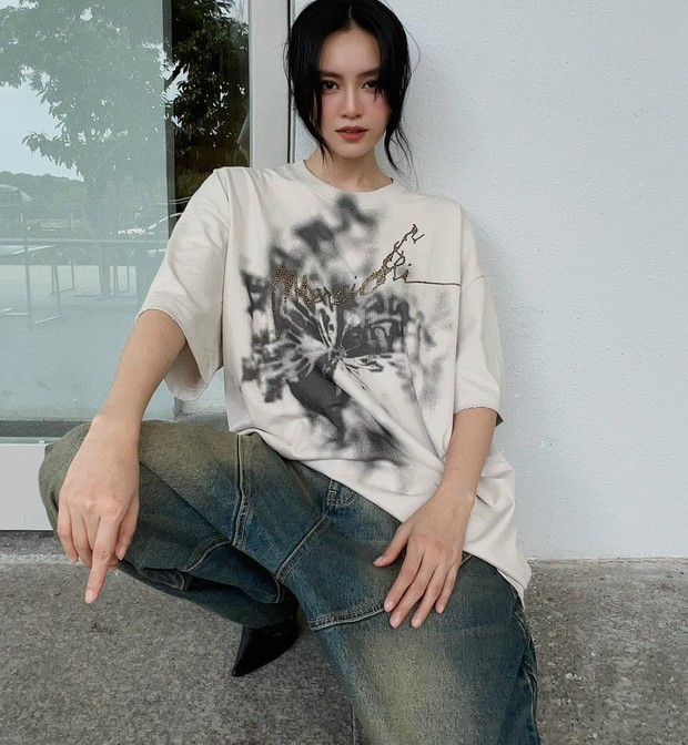 Khi áp dụng phong cách gen Z với áo thun họa tiết kết hợp với quần jeans bụi bặm, Ninh Dương Lan Ngọc vẫn tỏa sáng. Để không làm giảm đi nét "cool ngầu" của tổng thể trang phục, nữ diễn viên đã khéo chọn một đôi giày đen, mũi nhọn.