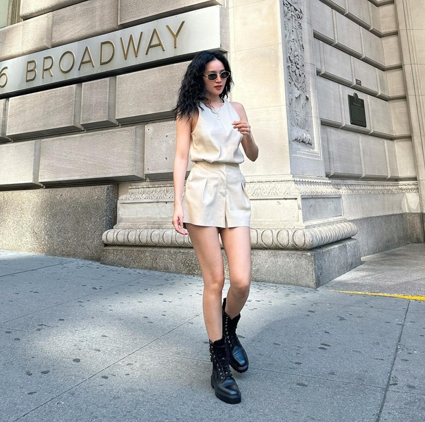 Công thức áo hai dây và quần short đồng bộ của Ninh Dương Lan Ngọc khá đơn giản, ai cũng có thể mặc đẹp. Với tông màu be làm chủ đạo, bộ trang phục giúp "hack" tuổi hiệu quả. Đôi giày combat boots tạo điểm nhấn đầy cá tính cho người diện.