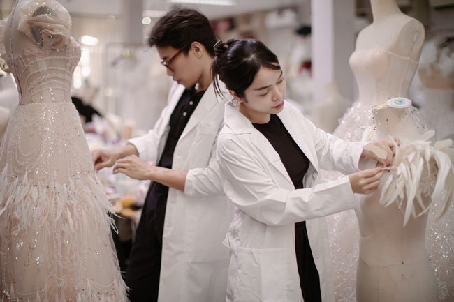 Nét đặc biệt của bộ sưu tập lần này xuất phát từ sự kết hợp hài hòa giữa màu sắc và chất liệu. Không còn là những chiếc váy cưới mang tông màu trắng truyền thống như các bộ sưu tập trước, loạt trang phục mới nhất được đội ngũ của NTK Trà Linh sử dụng những gam màu lạ lẫm và đa dạng như hồng, vàng, xanh da trời, tím.. cùng kỹ thuật tạo hình, đính kết những cánh hoa hồng, hoa ly... thủ công bằng lông vũ, voan tơ và draping trên thân váy.