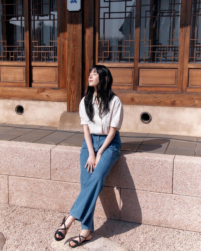 Áo sơ mi cộc tay rất được yêu thích trong mùa hè vì độ nhẹ mát, thoải mái khi diện. Mẫu áo này mang tới sự trẻ trung, nhưng vẫn thanh lịch và phảng phất nét cổ điển. Áo sơ mi cộc tay kết hợp rất ăn ý với quần jeans xanh để nhân đôi hiệu quả "hack" tuổi. Đôi sandal màu đen là mảnh ghép hoàn hảo của tổng thể outfit.