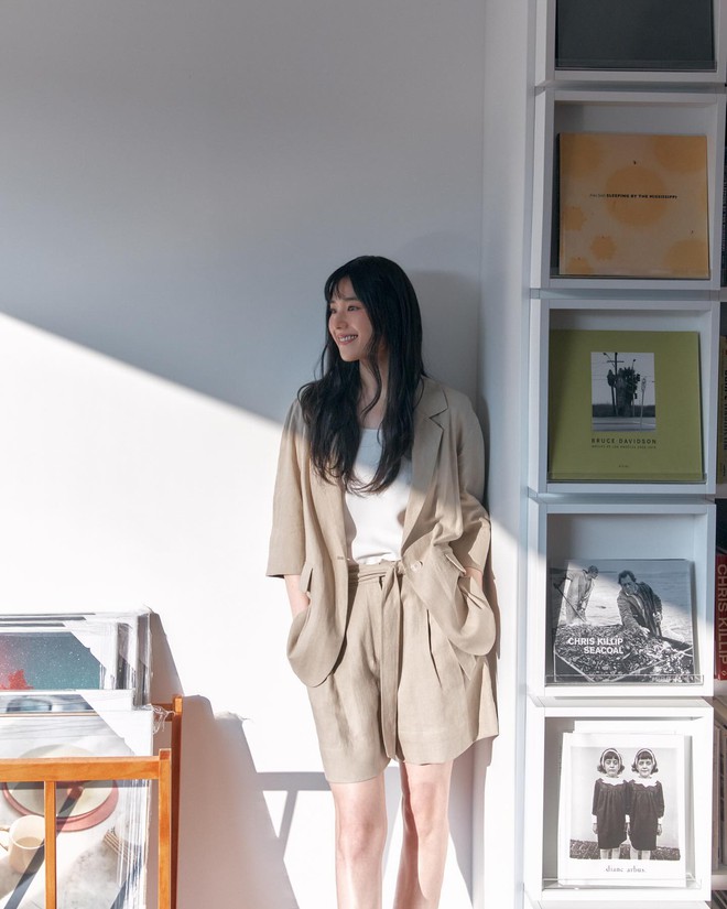 Bộ suit cộc tay, chất vải thô đũi khá phù hợp để diện trong mùa hè. Khi layer bên trong bộ suit màu be một chiếc áo trắng, Jung Eun Chae có được set trang phục trẻ trung, thanh lịch và rất hài hòa, tinh tế. Nếu sơ vin gọn gàng, hiệu quả tôn dáng sẽ tăng thêm.