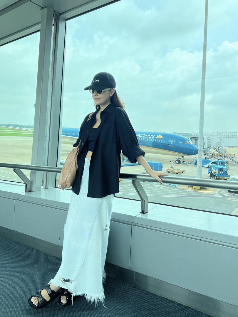 Quý cô tuổi 40 đừng nên bỏ qua trang phục denim. Kiểu đồ này rất trẻ trung và bụi bặm, nhưng không hề "lệch pha" với tuổi 40+. Phạm Quỳnh Anh lựa chọn outfit năng động gồm áo gile kết hợp với quần denim short. Cô tạo sự cân bằng cho bộ đồ bằng cách diện bên trong áo gile một chiếc t-shirt trắng.