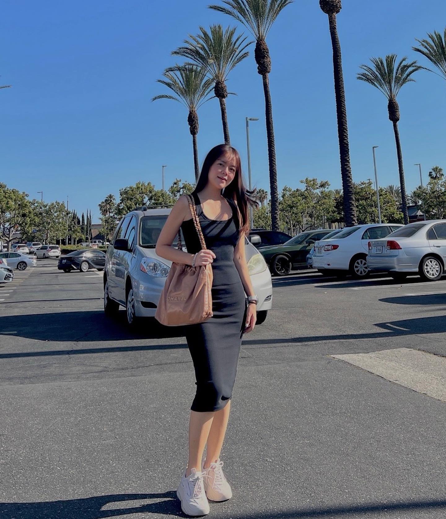 Váy hai dây mang tông màu đen có thiết kế không hề cầu kỳ, nhưng lại giúp nâng tầm phong cách hiệu quả. Khi ưu tiên thiết kế váy ôm dáng, Phạm Quỳnh Anh có được vẻ ngoài quyến rũ và nữ tính. Để "hack" tuổi hiệu quả hơn, nữ ca sĩ hoàn thiện outfit bằng một đôi sneaker trắng.