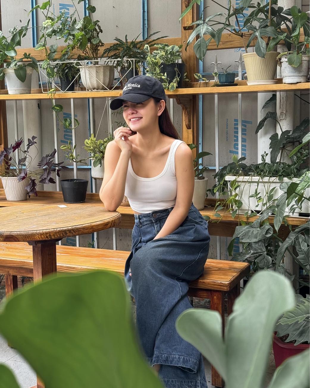Phạm Quỳnh Anh diện một set đồ đơn giản nhưng vẫn rất thời thượng gồm áo tank top màu trắng kết hợp với quần denim ống suông. Nếu chọn áo tank top dáng lửng, chị em sẽ không cần sơ vin, tổng thể vẫn có sự cao ráo, thanh thoát. Chiếc mũ lưỡi trai rất phù hợp với bộ trang phục khỏe khoắn, năng động.