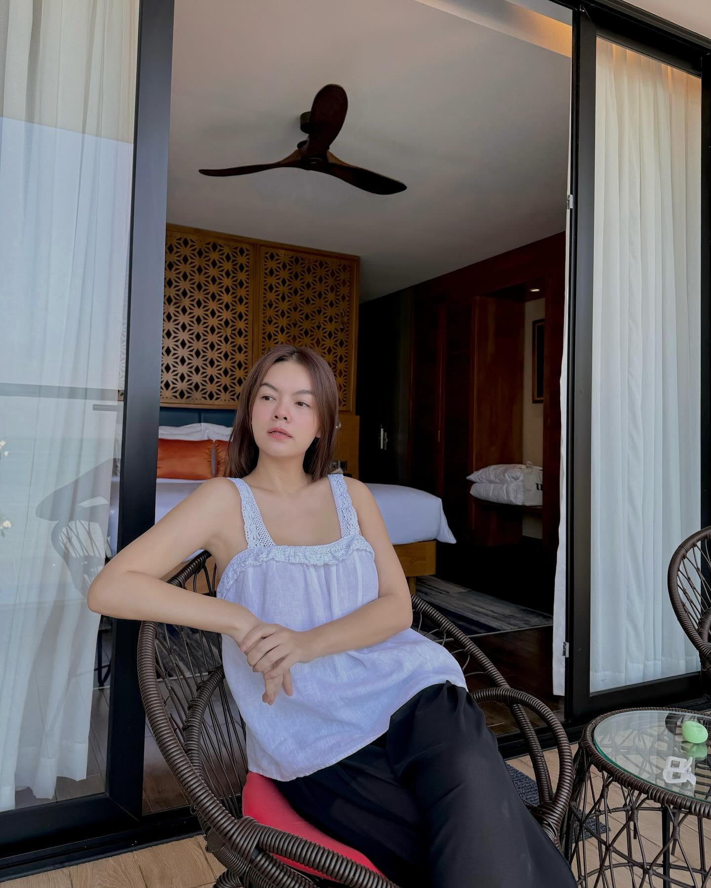 Kết hợp áo hai dây trắng vải thô với quần ống suông tông màu đen, Phạm Quỳnh Anh có được tổng thể trang phục thoải mái, bay bổng. Công thức trên còn có sự nữ tính và không hề cộng tuổi cho người mặc. Muốn ghi điểm sành điệu mà không tốn công sức phối đồ, chị em hãy tham khảo outfit trên.