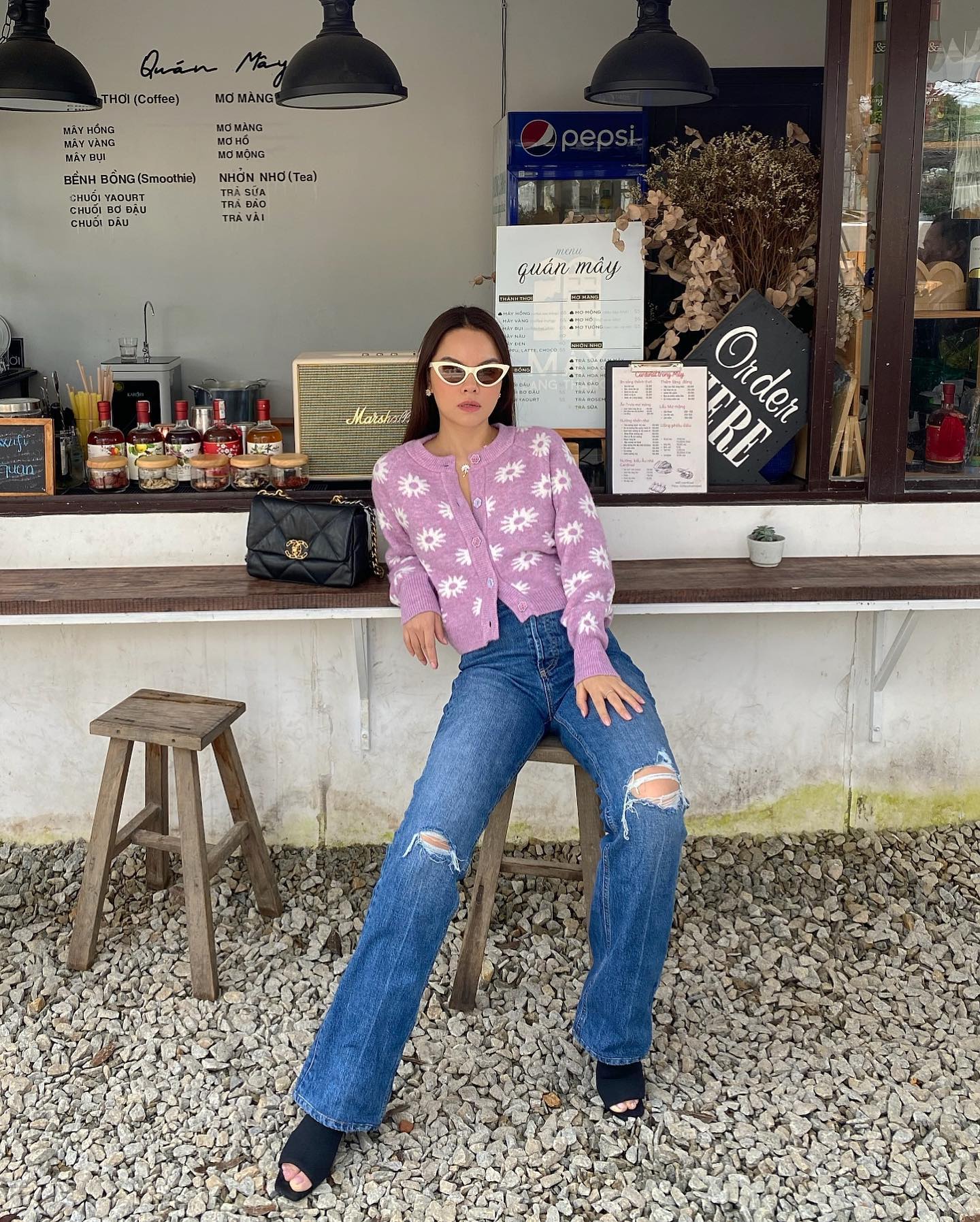 Phạm Quỳnh Anh cũng thường xuyên chọn quần jeans để hoàn thiện phong cách. Nữ ca sĩ ưu tiên quần jeans ống suông và đây là món thời trang sành điệu, hợp xu hướng hiện tại. Phạm Quỳnh Anh còn khéo léo kết hợp quần jeans ống suông với áo cardigan dáng lửng hoặc áo tank top rồi sơ vin gọn gàng. Cách phối đồ này vừa nhân đôi hiệu quả "hack" tuổi, vừa giúp tôn dáng tối ưu.