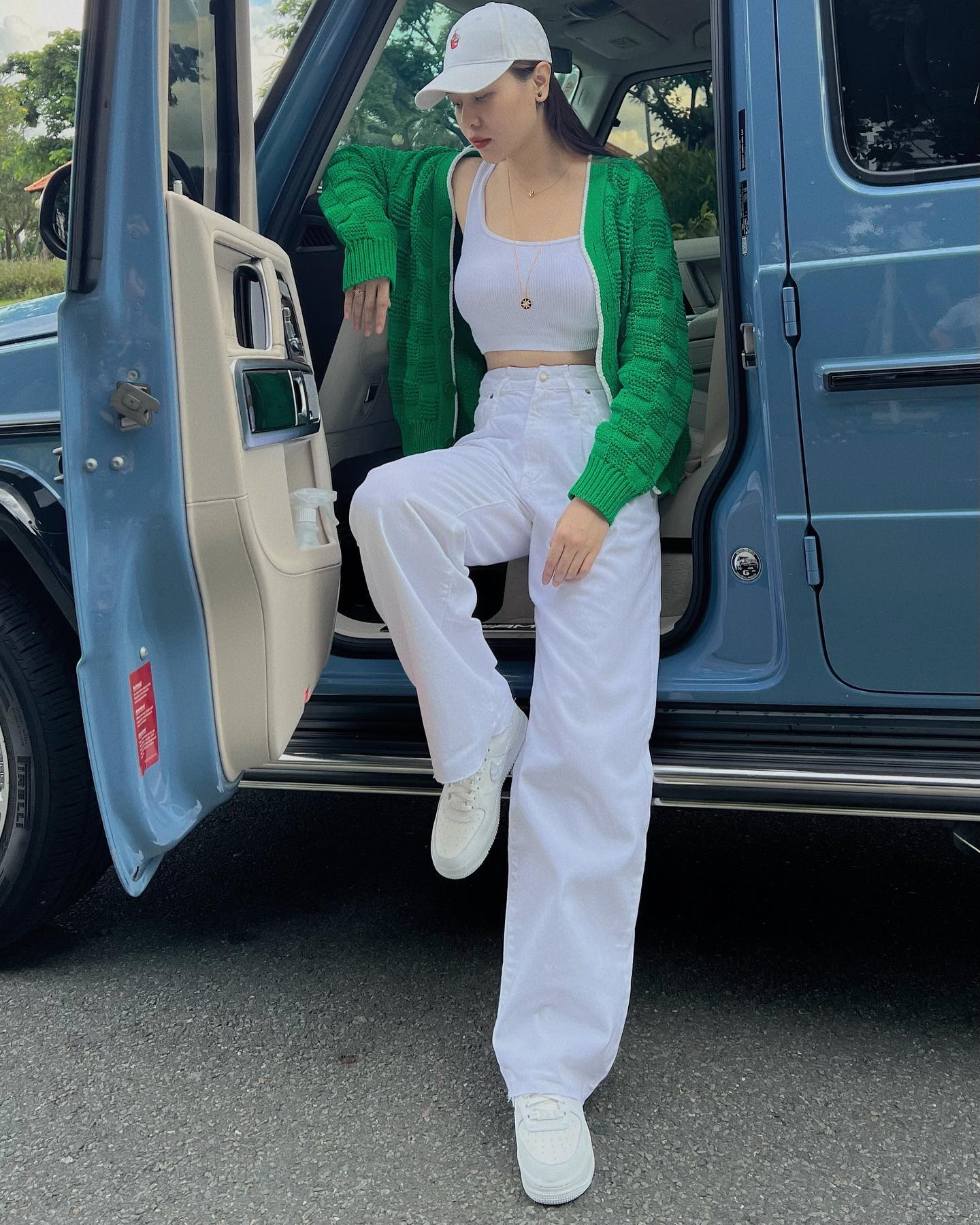 Dù chọn những mẫu quần ống rộng màu trung tính như đen hoặc trắng nhưng Đàm Thu Trang vẫn biết cách khiến vẻ ngoài thêm nổi bật. Cô kết hợp quần ống rộng màu đen với áo crop top xuyệt tông để ghi điểm quyến rũ, trẻ trung. Công thức tươi tắn, bắt mắt hơn là quần trắng kết hợp với áo crop top và cardigan màu xanh lá đậm.