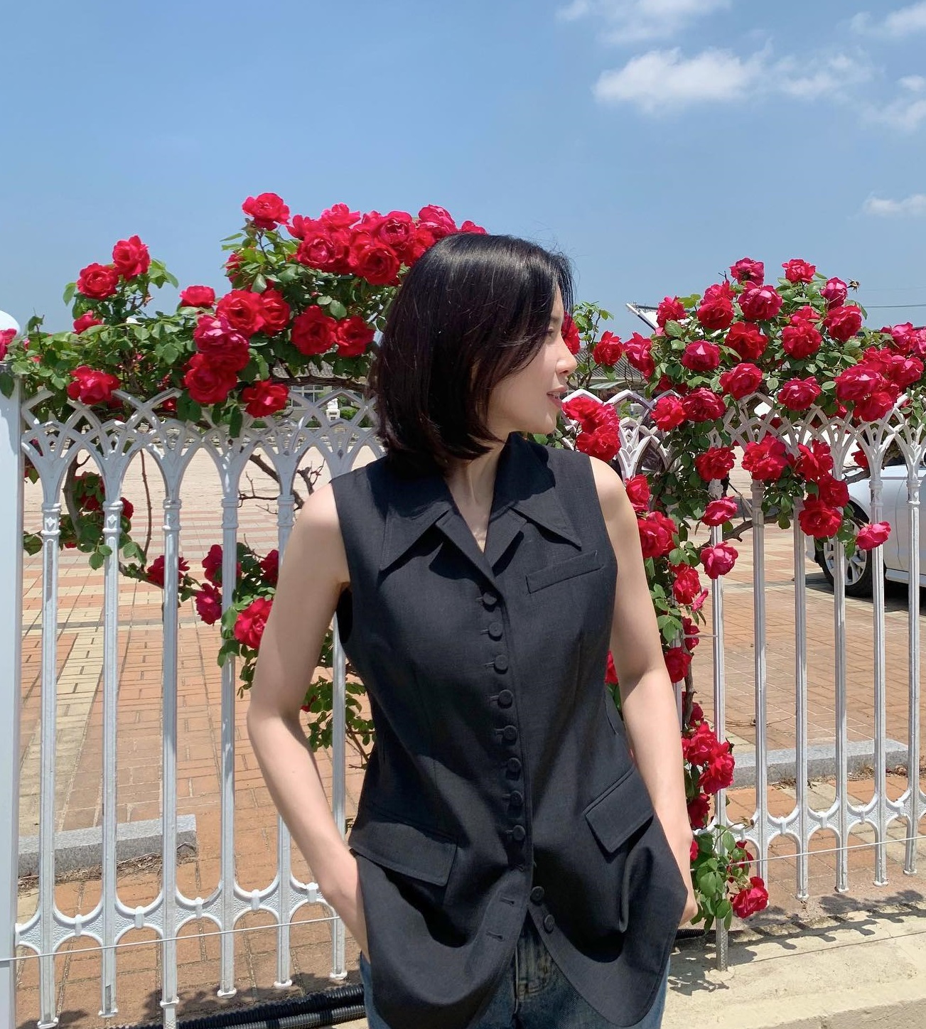 Áo gile đang là xu hướng thời trang được ưa chuộng. Mẫu áo này rất phù hợp với phụ nữ trên 40 tuổi vì sự sang trọng, trẻ trung. Lee Bo Young kết hợp mẫu áo với quần jeans bụi bặm để hiệu quả "hack" tuổi được tăng thêm nhưng độ tinh tế không hề thuyên giảm.