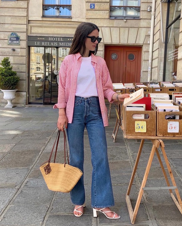 Sự kết hợp giữa áo thun trắng, quần jeans xanh và áo kẻ sọc tông màu đỏ giúp tăng hiệu quả "hack" tuổi. Đôi sandal quai mảnh và túi cói rất phù hợp với bộ trang phục vì giúp vẻ ngoài nổi bật, nữ tính hơn.