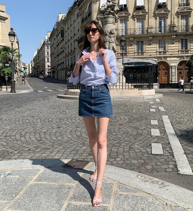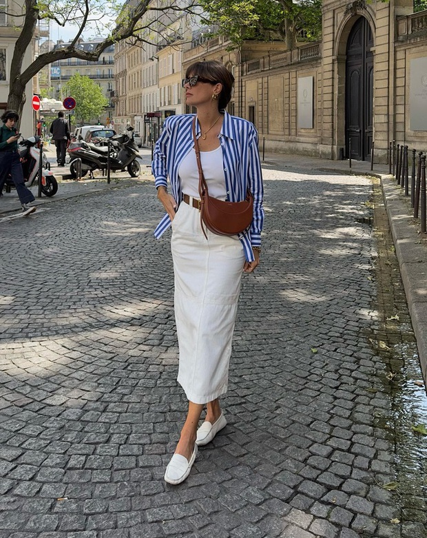 Áo sơ mi kẻ sọc có thể được diện theo cách đầy nữ tính. Cụ thể, quý cô người Pháp đã khoác áo sơ mi kẻ sọc bên ngoài áo tank top trắng, chân váy suông. Khi sơ vin gọn gàng và tô điểm thêm thắt lưng, vẻ ngoài của người diện càng thêm sang xịn mịn. Các nàng có thể áp dụng công thức ngọt ngào, thanh lịch này đi dạo phố hoặc tới công sở.
