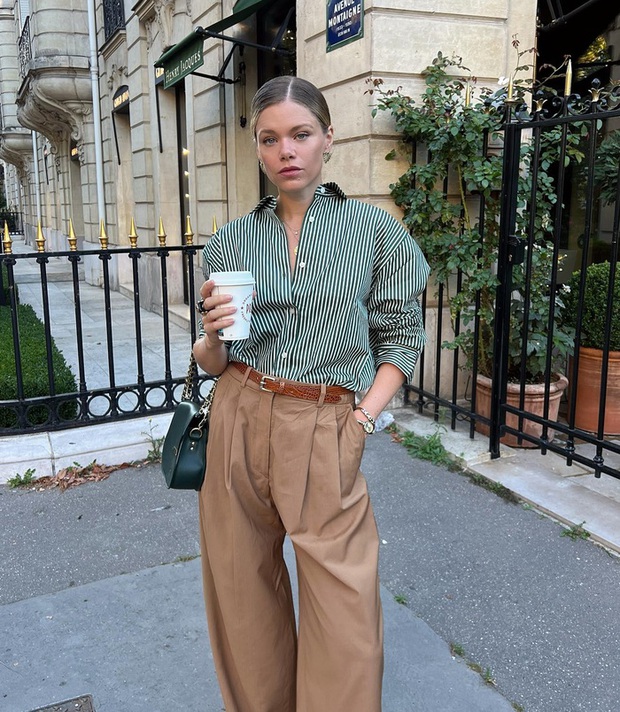 Áo sơ mi kẻ tông màu xanh lá và quần màu be tạo nên bộ trang phục sang xịn mịn. Tổng thể set đồ thêm phần nổi bật nhờ các món phụ kiện như khuyên tai, dây chuyền vàng. Để đảm bảo sự hài hòa cho tổng thể outfit, chị em nên chọn túi xách màu xanh và thắt lưng tông màu nâu.