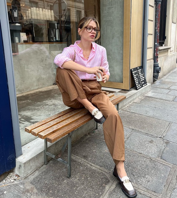 Bên cạnh áo sơ mi kẻ sọc tông xanh, bạn đừng bỏ qua phiên bản màu hồng. Kiểu áo này rất trẻ trung, ngọt ngào. Khi kết hợp áo sơ mi tông hồng với quần màu be, bạn sẽ có được bộ trang phục hài hòa, tinh tế. Đôi loafer đã cộng thêm điểm thanh lịch cho tổng thể outfit.