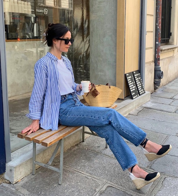 Áo sơ mi kẻ sọc và quần jeans là công thức quen thuộc. Dẫu vậy, đây là sự kết hợp luôn chuẩn mốt, ai cũng có thể mặc đẹp. Để nâng tầm bộ trang phục, chị em chỉ cần áp dụng những tuyệt chiêu cơ bản như sơ vin, tô điểm thắt lưng da và đi giày màu trung tính.