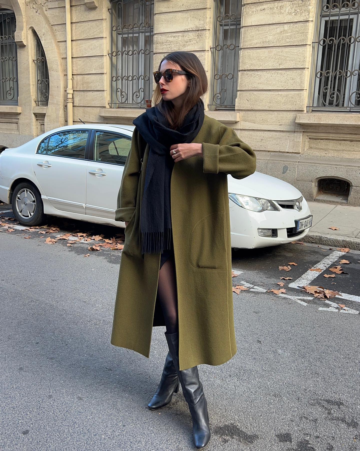 Mẫu áo khoác dáng dài, màu xanh ô-liu có nét nổi bật nhưng vẫn có sự trang nhã. Tổng thể trang phục càng thêm sang trọng khi áo khoác dạ được phối với váy đen, quần tất đen và boots cao cổ. Chiếc khăn quàng không chỉ cho hiệu quả giữ ấm mà còn giúp tổng thể trang phục thêm phóng khoáng, thời thượng.