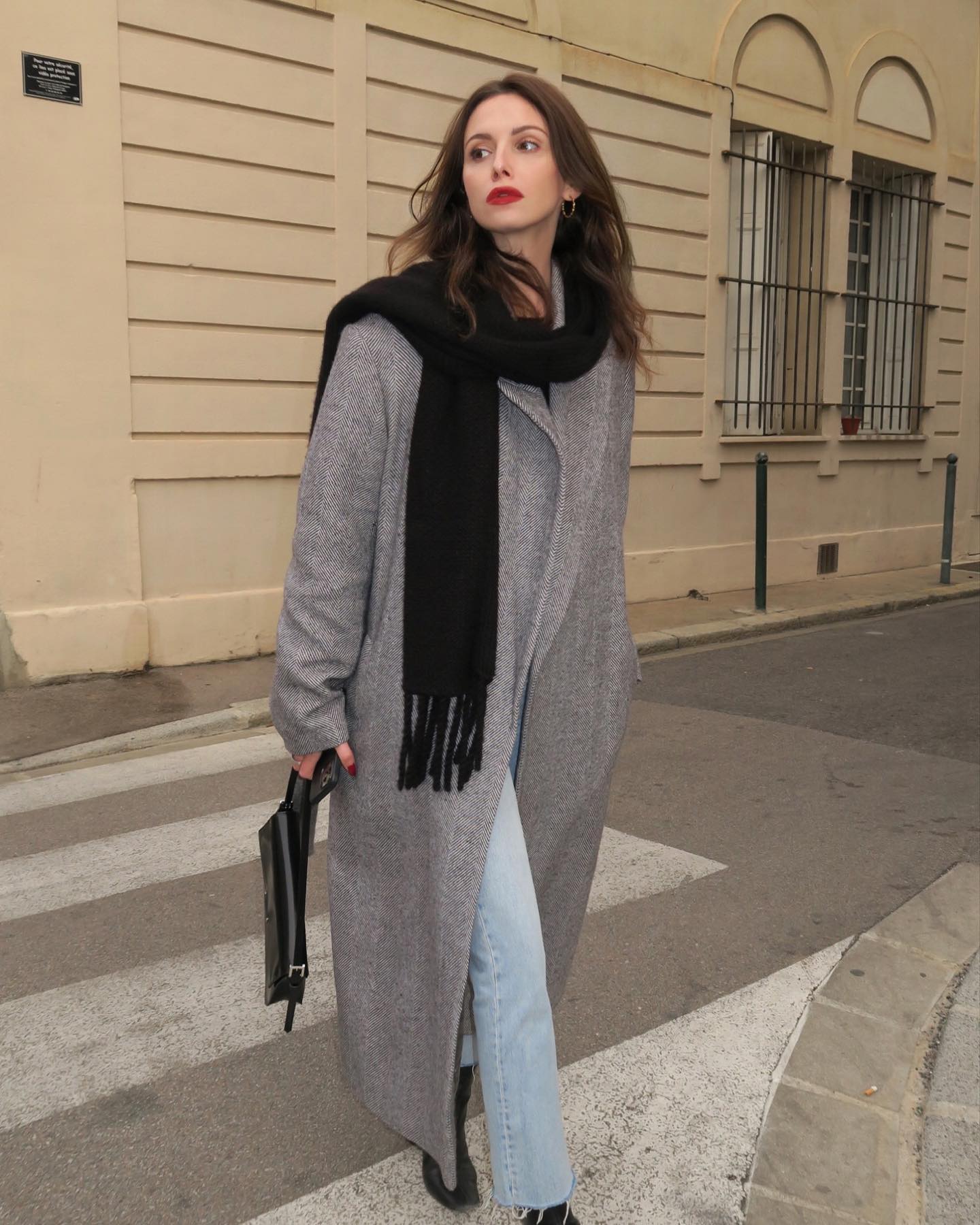 Tông màu xám đang là xu hướng thịnh hành và chị em đừng bỏ qua gợi ý trang phục của Solène Lara. Cô đã kết hợp áo dạ màu xám với quần jeans xanh để tạo nên tổng thể trang phục đầy trẻ trung, thanh lịch. Để giữ nguyên nét tinh tế của outfit, các nàng nên chọn khăn quàng và giày tông màu đen.