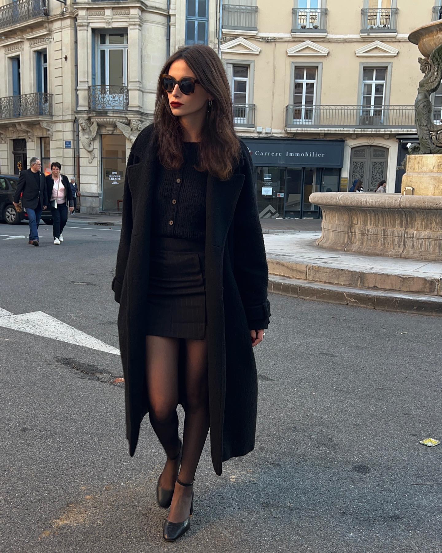 Solène Lara gợi ý cách diện trang phục màu đen đầy trẻ trung, đó là kết hợp áo cardigan với chân váy ngắn, áo khoác dáng dài và boots thấp cổ. Không chỉ ghi điểm ngọt ngào và nữ tính, tổng thể trang phục này còn rất sang trọng, long lanh, phù hợp để diện trong mùa lễ hội.