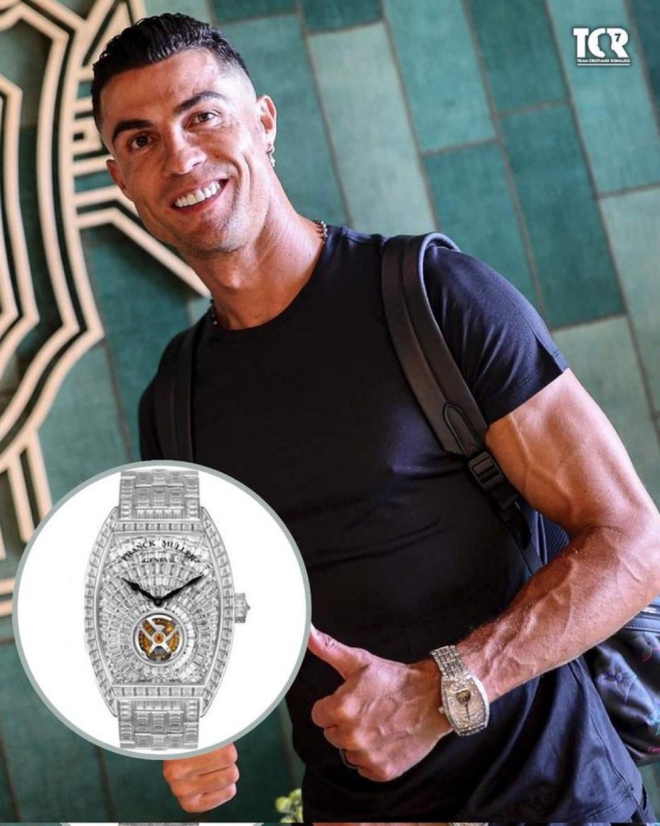 Tại bức ảnh này, dân tình nhanh chóng phát hiện ra Ronaldo đang đeo trên tay chiếc đồng hồ trị giá 1,5 triệu USD của hãng Franck Muller được đính 600 viên kim cương. Trước đó, Ronaldo nhiều lần đeo chiếc đồng hồ này ở đời thường lẫn sự kiện.