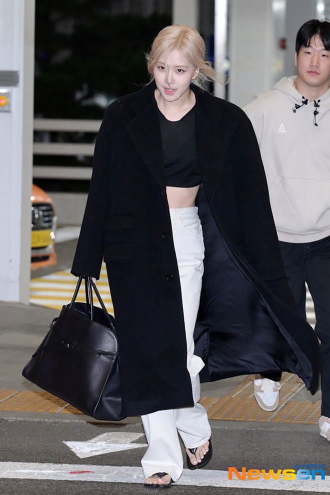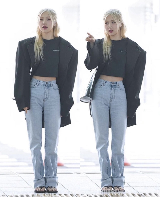 Rosé biến sân bay thành sàn catwalk khi diện áo blazer, áo khoác dáng dài form menswear của Saint Laurent. Giọng ca chính BLACKPINK đều lựa chọn combo áo crop top phối cùng quần jeans để outfit mang vẻ trẻ trung, cá tính