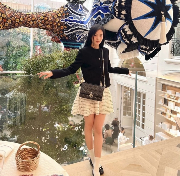 Chị cả BLACKPINK lại ưa chuộng những mẫu áo mang vẻ điệu đà, nữ tính. Jisoo đầy xinh đẹp, dịu dàng trong mẫu áo dạ ngắn của Dior, phối cùng váy liền và giày đế bệt