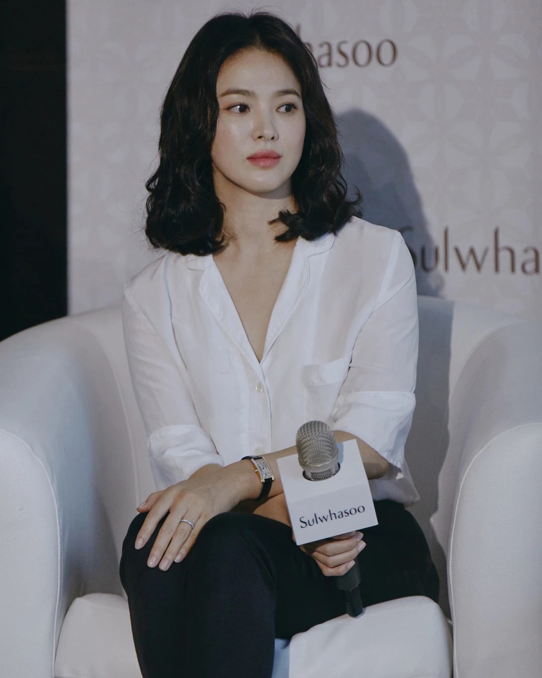Công thức áo sơ mi trắng và chân váy nâu nhạt có sự trang nhã, chuẩn thanh lịch. Dẫu vậy, bộ trang phục không hề cộng tuổi cho người mặc. Song Hye Kyo còn gợi ý kiểu tóc lý tưởng để áp dụng khi diện áo sơ mi trắng, đó là tóc búi thấp dịu dàng, nữ tính.