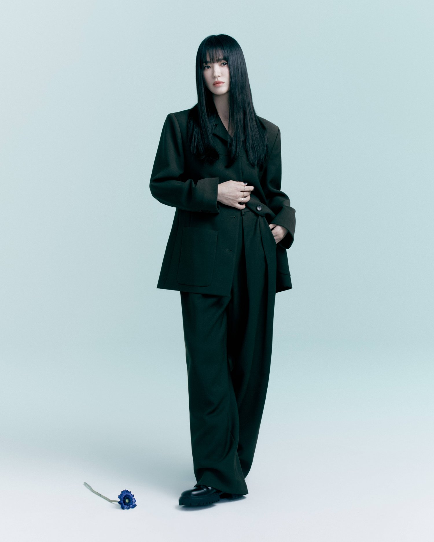 Song Hye Kyo toát lên vẻ cá tính, sang trọng khi diện bộ suit mang tông màu đen làm chủ đạo. Chính mẫu áo blazer dáng rộng đã tạo sự trẻ trung cho outfit, nhưng không khiến nét thanh lịch bị thuyên giảm. Với kiểu tóc duỗi thẳng, mái bằng, diện mạo của Song Hye Kyo gây ấn tượng ở nét quyến rũ, huyền bí.