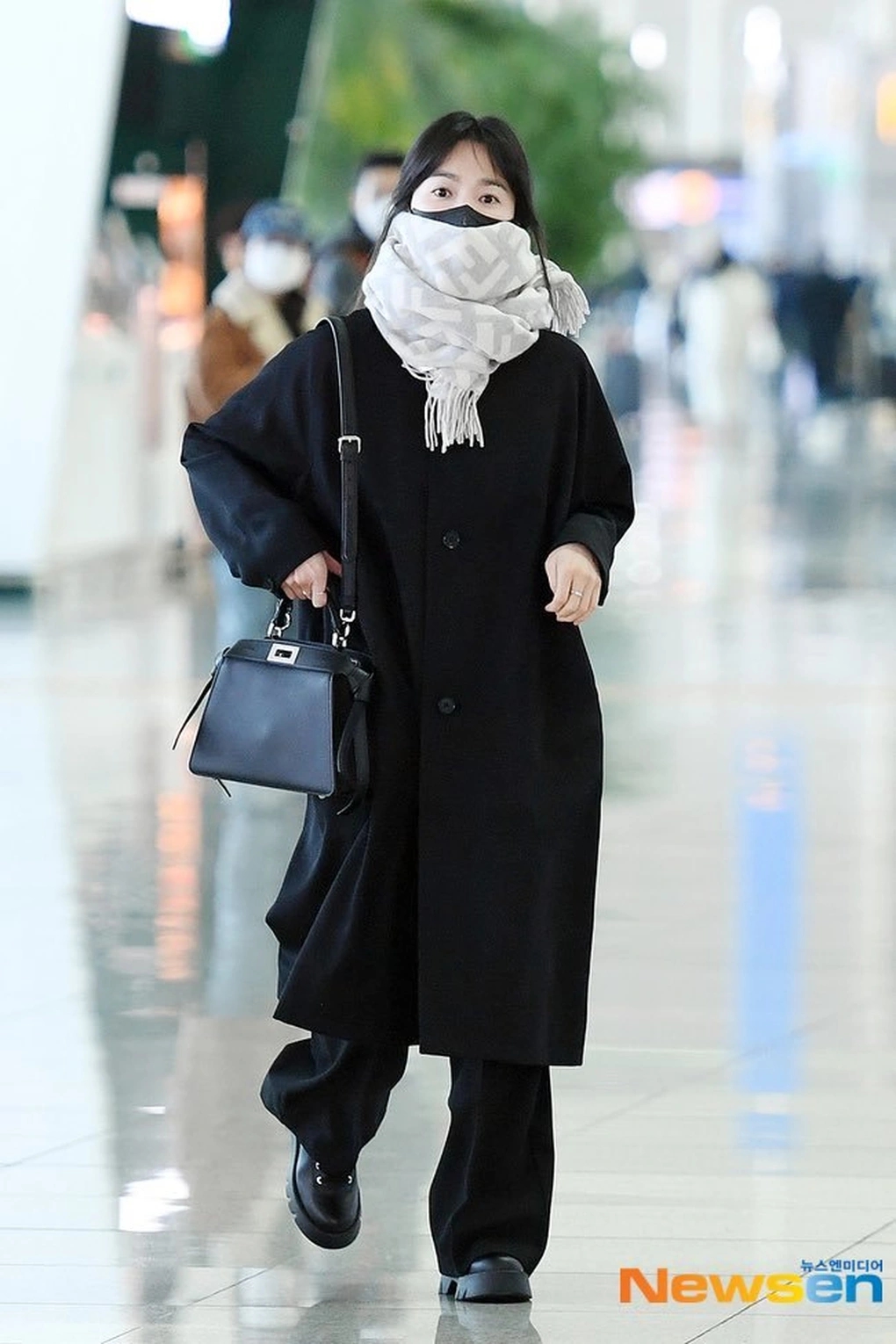 Diện cả một set đồ đen nhưng Song Hye Kyo không bị cộng tuổi. "Bí kíp" ở đây là lựa chọn các item tông màu đen với sắc độ đậm và nhạt khác nhau. Như vậy, set trang phục trở nên thời thượng, trẻ trung hơn mà vẫn ghi điểm sang trọng, trang nhã. Bộ trang phục của Song Hye Kyo là gợi ý hoàn hảo để nàng công sở diện trong những ngày lạnh giá.