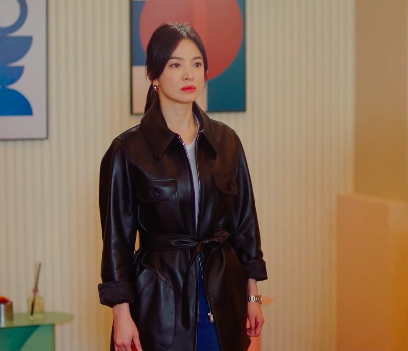 Áo khoác da vốn đã nổi bật nên người diện chỉ cần kết hợp với một kiểu áo và quần dài/chân váy đơn giản, là có thể tạo nên bộ trang phục sành điệu. Đường nhấn eo góp phần tôn dáng và nâng tầm phong cách. Vẻ ngoài của Song Hye Kyo trở nên long lanh hơn nhờ đôi khuyên tai.