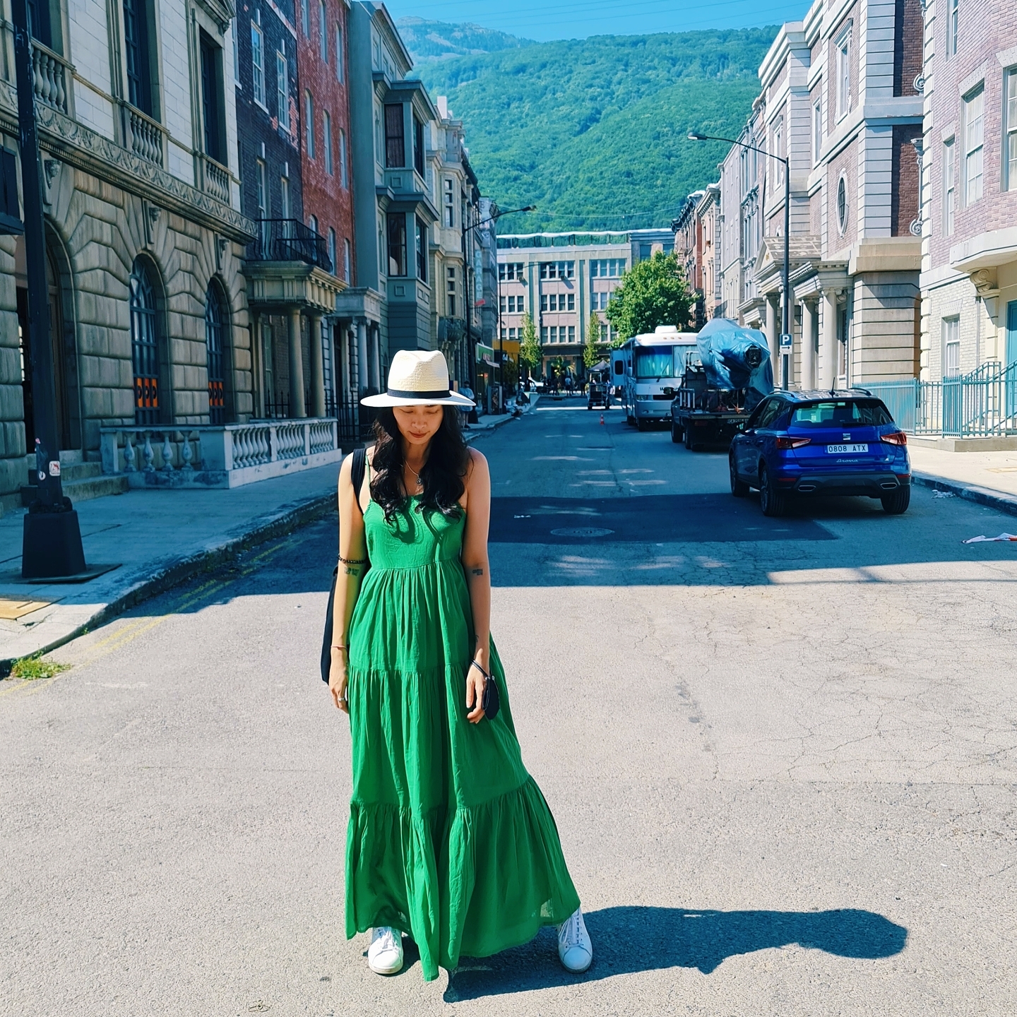 Váy xanh đậm có sự nổi bật, tươi tắn, rất lý tưởng để mặc đi du lịch. Thay vì chọn các món phụ kiện màu sắc rực rỡ, Ngô Thanh Vân ưu tiên túi xách, mũ và giày màu trung tính. Như vậy, set đồ sẽ không trở nên rối mắt hay "sến sẩm".