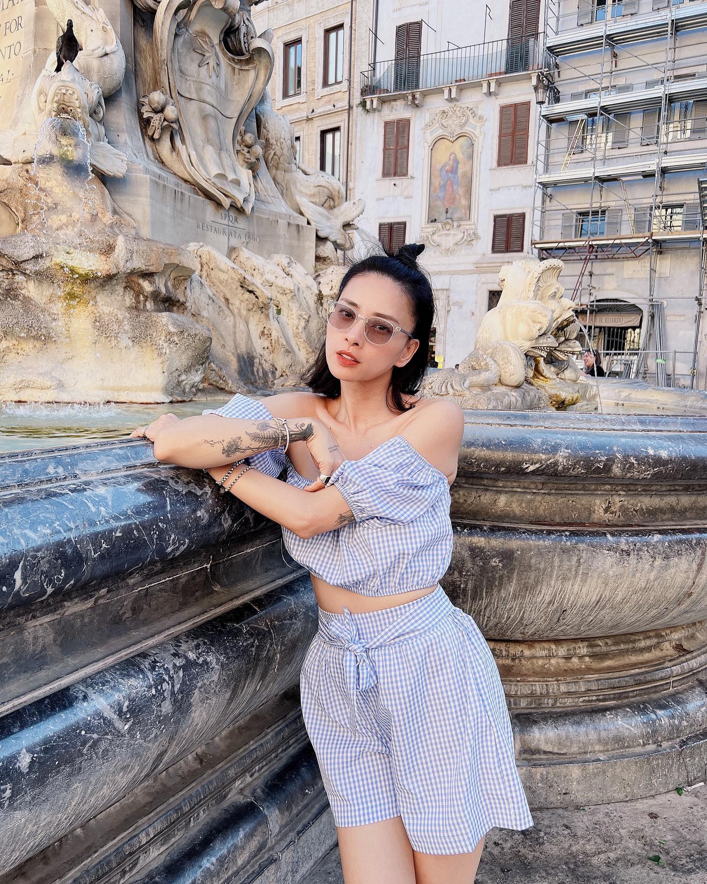 Mẫu váy ngắn họa tiết gingham đã mang đến sự trẻ trung và tươi tắn cho Ngô Thanh Vân. Kiểu váy này khá bắt mắt nên Ngô Thanh Vân không tô điểm phụ kiện quá cầu kỳ. Thay vào đó, cô chỉ nhấn nhá kính râm để đảm bảo sự hài hòa, đồng thời bảo vệ mắt khi hoạt động ngoài trời.
