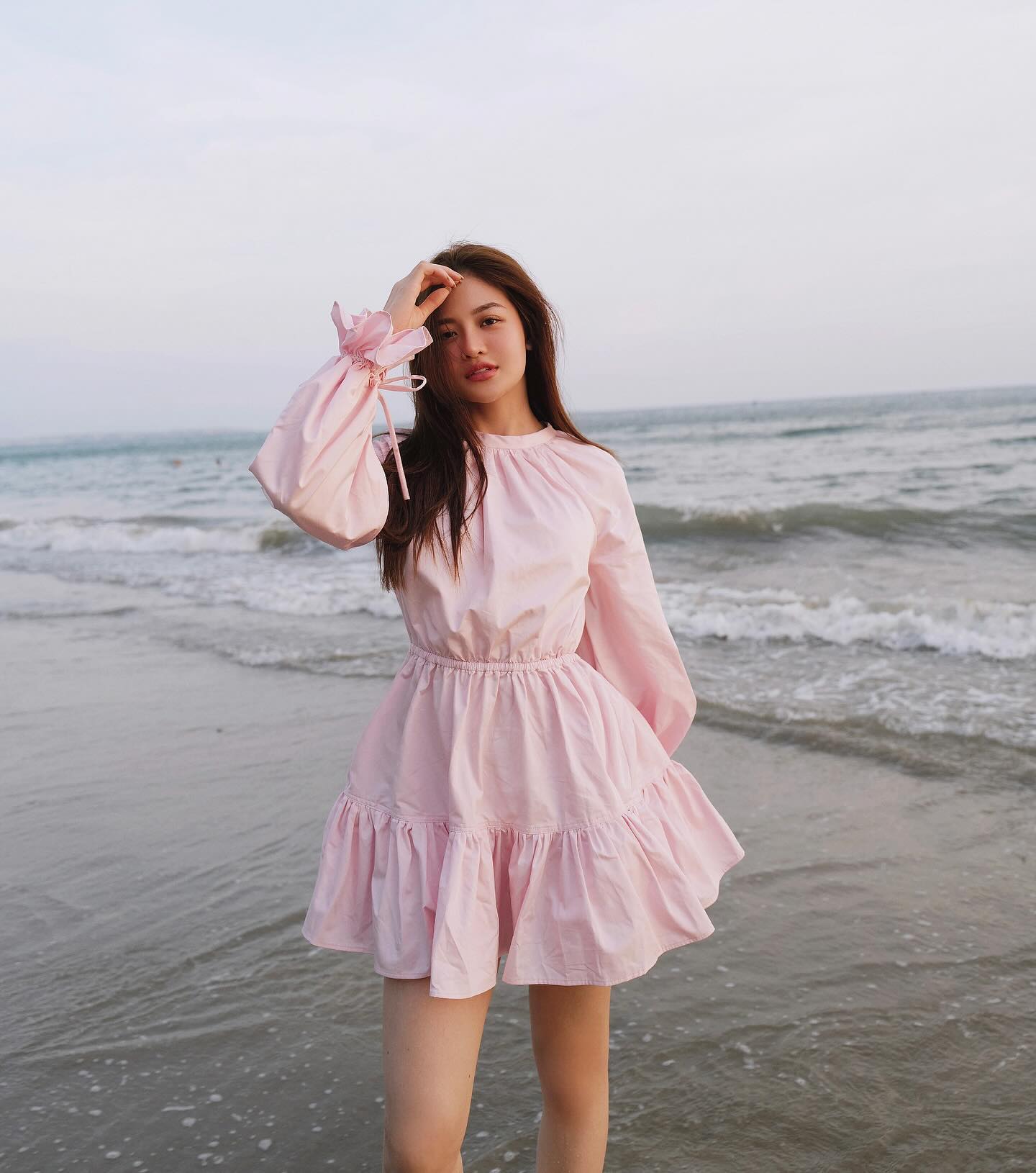 Váy hồng pastel, tay bồng mang đến nét tươi trẻ, ngọt ngào cho phong cách nên rất phù hợp với các chuyến du lịch. Chị em nên ưu tiên các thiết kế có chi tiết nhấn eo như lựa chọn của Thùy Anh để tôn dáng hiệu quả.