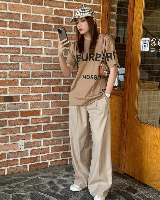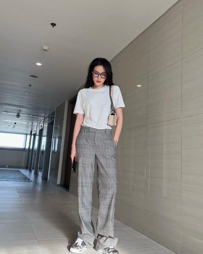 Kỳ Duyên mang đến làn gió mới cho phong cách nhờ kết hợp quần kẻ ô với áo thun trắng. Cô không quên sơ vin gọn gàng để nâng tầm outfit. Như thường lệ, Kỳ Duyên vẫn chọn giày thể thao để hoàn thiện set áo thun và quần ống rộng trẻ trung, phóng khoáng.