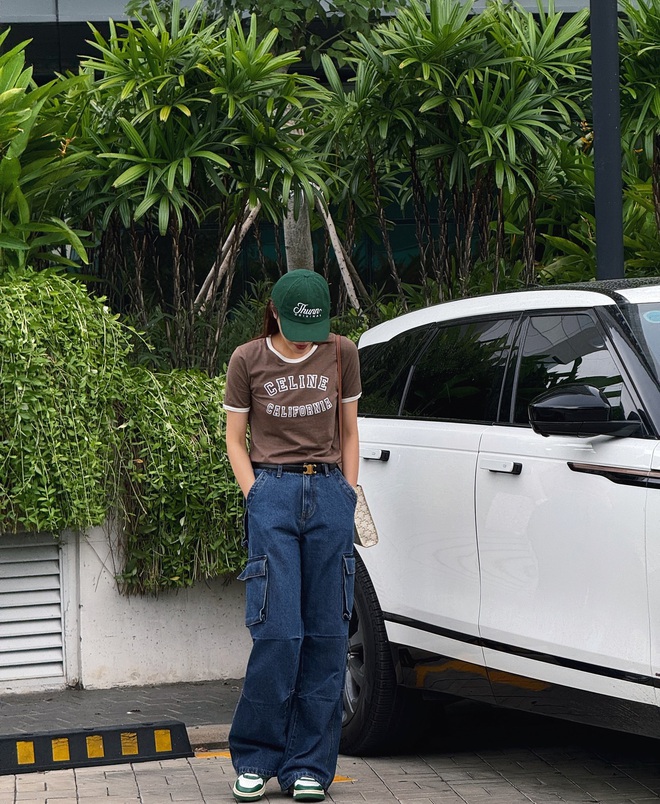 Áo thun màu nâu không chỉ có sự trẻ trung mà còn ghi điểm ở nét trang nhã, sang trọng. Kỳ Duyên đã kết hợp mẫu áo này với quần jeans túi hộp, từ đó tạo nên bộ trang phục cá tính, thời thượng. Thao tác sơ vin giúp nâng tầm vẻ thanh lịch cho outfit. Những món thời trang như giày sneaker, mũ lưỡi trai đều ăn nhập hoàn hảo với bộ cánh.