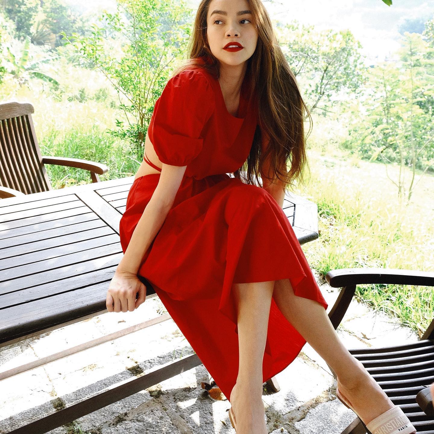 Hồ Ngọc Hà gây ấn tượng ở nét sang trọng, yêu kiều khi diện mẫu váy đỏ, có chi tiết cut-out. Mẫu váy này cũng mang đến hiệu quả "hack" tuổi và rất ăn ảnh. Các nàng không nên chọn những mẫu giày quá đứng dáng khi diện set váy trên. Một đôi dép lê hoặc sandal sẽ giúp chị em hoàn thiện outfit phù hợp với các chuyến du lịch.