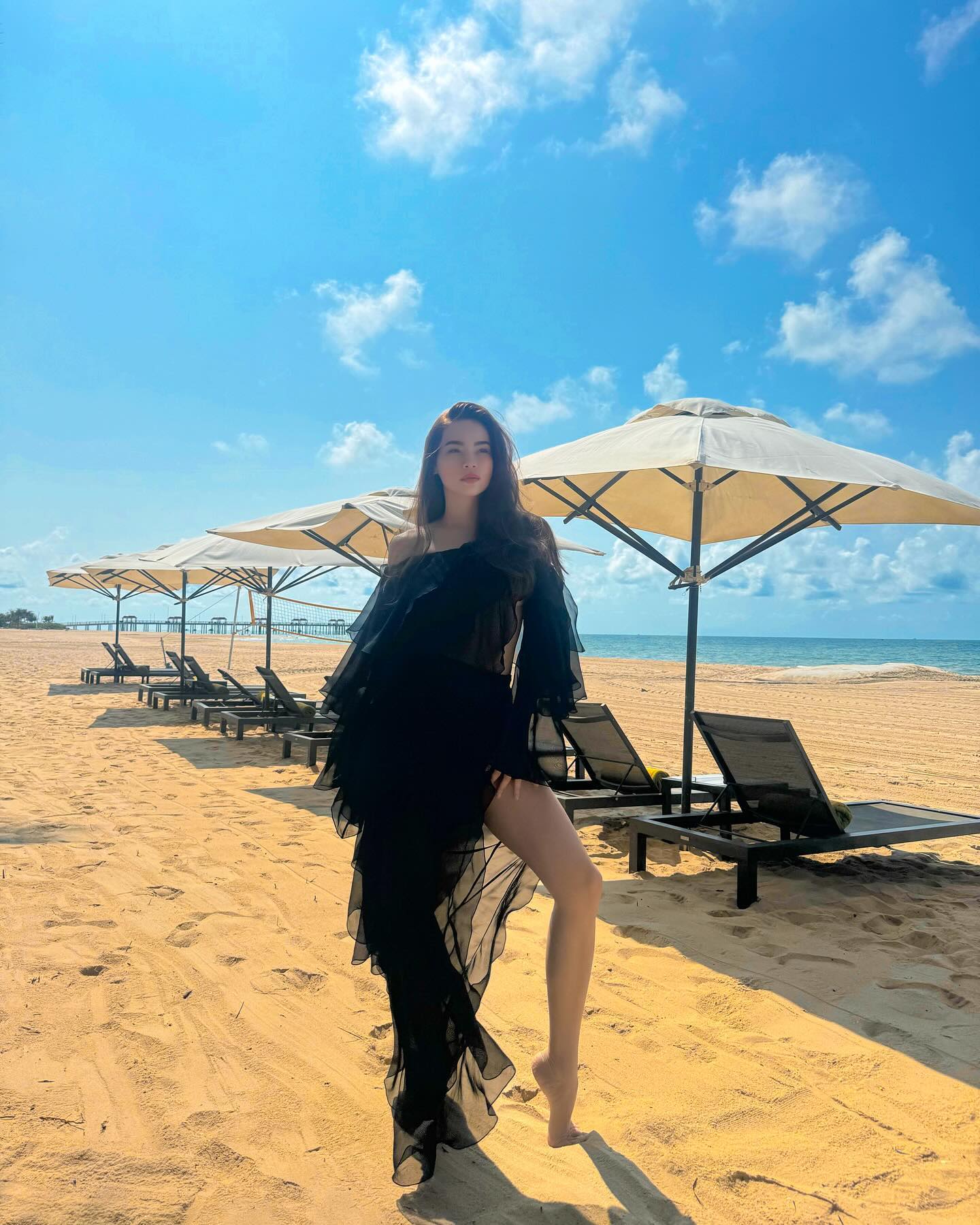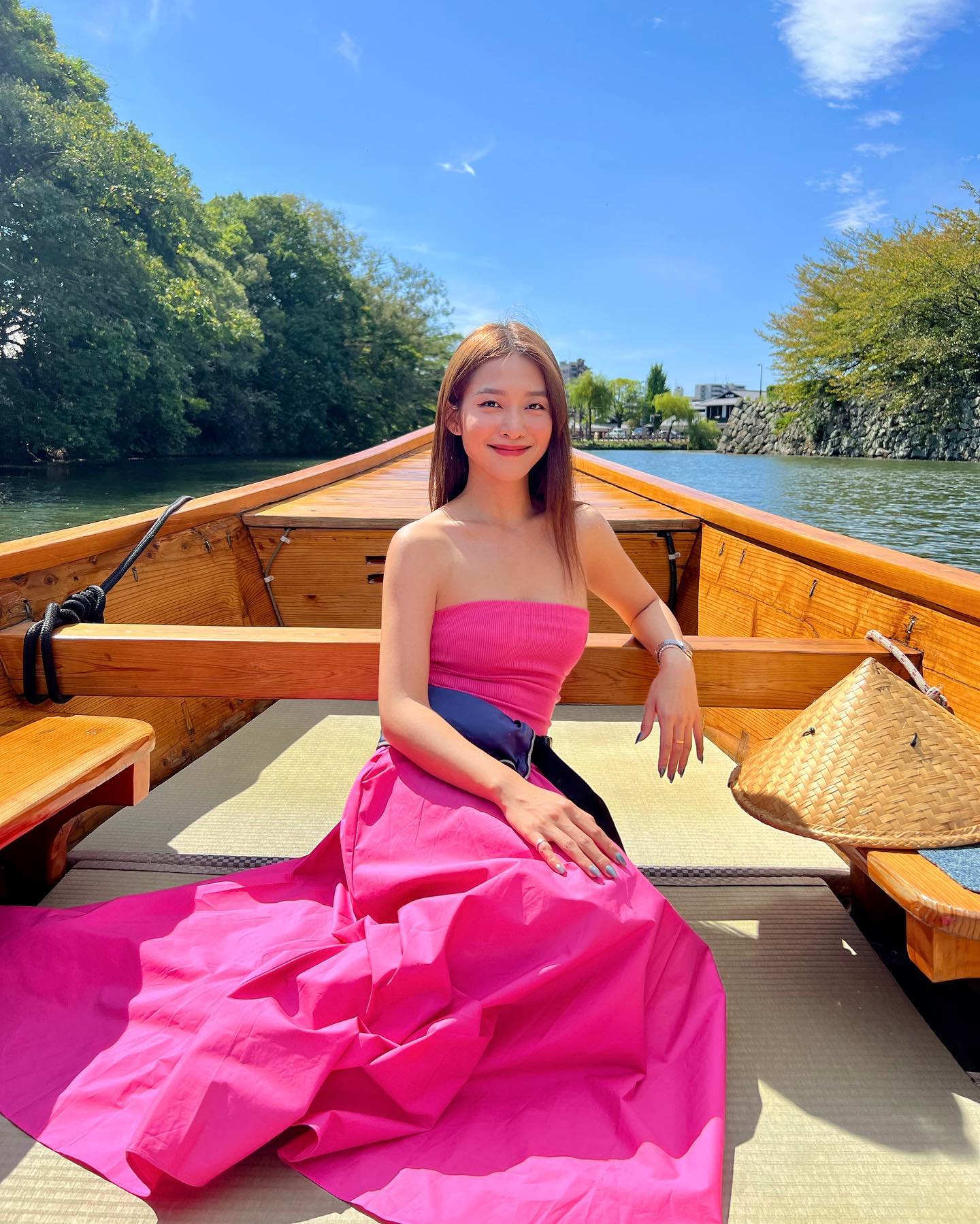 Các nàng cũng đừng bỏ qua những set váy có màu sắc rực rỡ khi đi du lịch. Nhờ chọn mẫu váy tông màu hồng đậm, Khả Ngân đã có được diện mạo rất nổi bật và ăn ảnh. Thiết kế dáng quây của mẫu váy còn giúp vẻ ngoài của người mặc thêm quyến rũ.