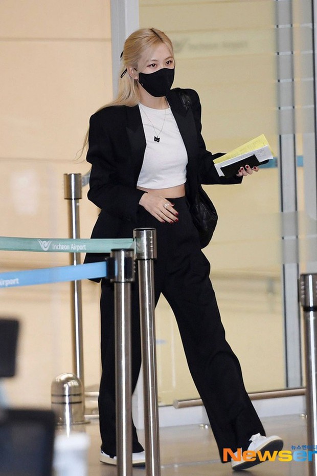 Bộ suit màu đen là kiểu trang phục hết sức cơ bản trong tủ đồ mùa lạnh. Dẫu vậy, bộ suit đen không gây cảm giác nhàm chán và luôn chuẩn mốt. Để vẻ ngoài trở nên phóng khoáng và trẻ trung, Rosé đã kết hợp bộ suit màu đen với áo crop top và giày sneaker trắng. Những món đồ này giúp thắp sáng cả set trang phục, mà không làm giảm đi nét tinh tế.