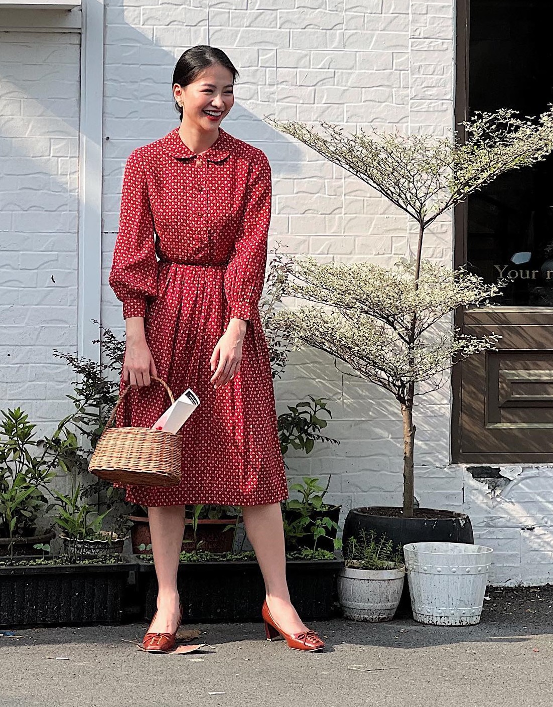 Hoa hậu Phương Khánh có được vẻ ngoài nữ tính và cổ điển khi diện mẫu váy họa tiết, tay bồng mang gam màu đỏ. Những món thời trang như đôi giày mũi vuông, túi cói đều phù hợp với set váy xinh tươi. Cuối cùng, Phương Khánh còn gợi ý màu son hoàn hảo để tô điểm cho nhan sắc, đó là son đỏ đậm.