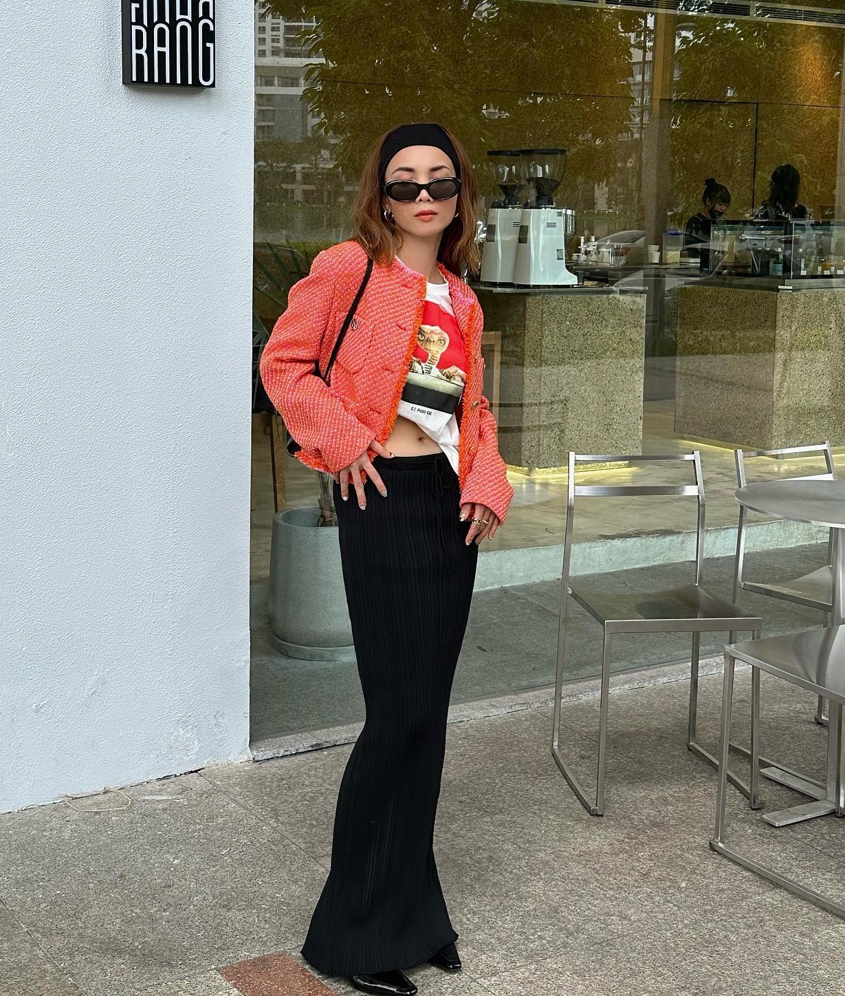 Cá tính nhưng không kém phần sang trọng là set đồ gồm áo thun kết hợp với chân váy dài, áo khoác vải tweed của Yến Trang. Thiết kế chân váy dài thướt tha có thể gây "dìm" dáng và bí kíp của Yến Trang chính là biến tấu áo thun thành một chiếc crop top để "ăn gian" chiều cao hiệu quả.