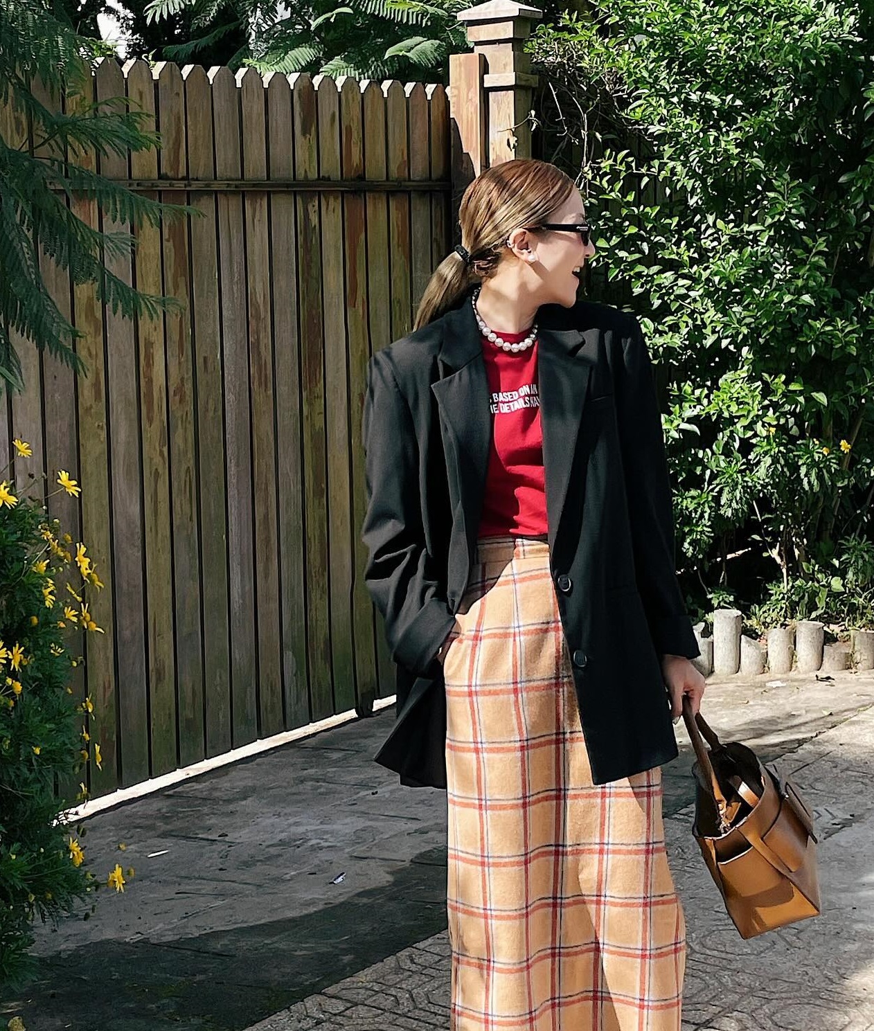 Set trang phục của Yến Nhi ghi điểm ở sự trẻ trung và sang xịn mịn. Cô kết hợp áo thun màu đỏ với chân váy kẻ ô, khoác ngoài blazer màu đen để tạo nên bộ trang phục nổi bật, mà vẫn có sự hài hòa, tinh tế. Chiếc vòng cổ ngọc trai có vai trò nâng tầm cả tổng thể outfit.