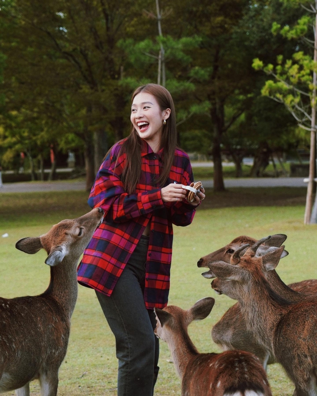 Yêu thích phong cách năng động và trẻ trung, chị em đừng bỏ qua công thức diện đồ gồm áo sơ mi đỏ kẻ ô kết hợp với quần jeans đen. Dù rất nổi bật, bộ trang phục của Khả Ngân vẫn có sự hài hòa và hợp mốt.