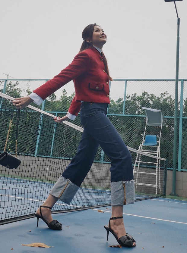 Phạm Thanh Hằng gợi ý một cách diện đồ đỏ không khó để áp dụng. Công thức của cô gồm áo khoác cổ tròn, áo trắng, quần jeans màu đen. Tổng thể trang phục này có sự đan xen giữa nét trẻ trung và vẻ sang trọng, thanh lịch. Phạm Thanh Hằng tăng điểm nổi bật cho outfit bằng một đôi giày sandal gắn nơ.