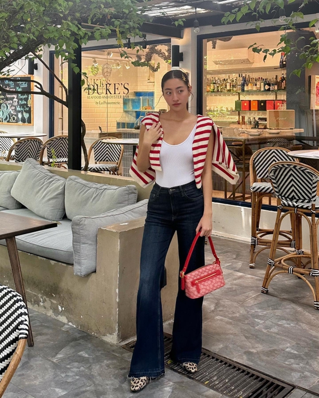 Hoa hậu Lương Thùy Linh gây ấn tượng ở sự trẻ trung và năng động khi diện áo thun màu đỏ với quần jeans xanh thẫm. Để cân bằng set trang phục, nàng hậu đã khéo léo tô điểm một chiếc túi xách màu trắng. Đây là ý tưởng diện đồ đáng tham khảo cho những buổi dạo phố cuối tuần.
