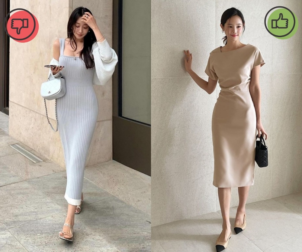 Váy len tăm mặc dù tôn dáng nhưng có thể khiến bạn trông già dặn và kém thanh lịch. Hãy thử thay thế váy len tăm bằng các mẫu đầm trơn, chẳng hạn như đầm liền hoặc đầm xòe nhẹ với chất vải dày dặn, không lộ rõ đường cong, những kiểu đầm này sẽ giúp bạn trông hiện đại và tinh tế hơn. Để tăng thêm sự chỉnh chu, bạn có thể kết hợp đầm với các loại phụ kiện như túi xách, vòng cổ, thắt lưng, sandals.