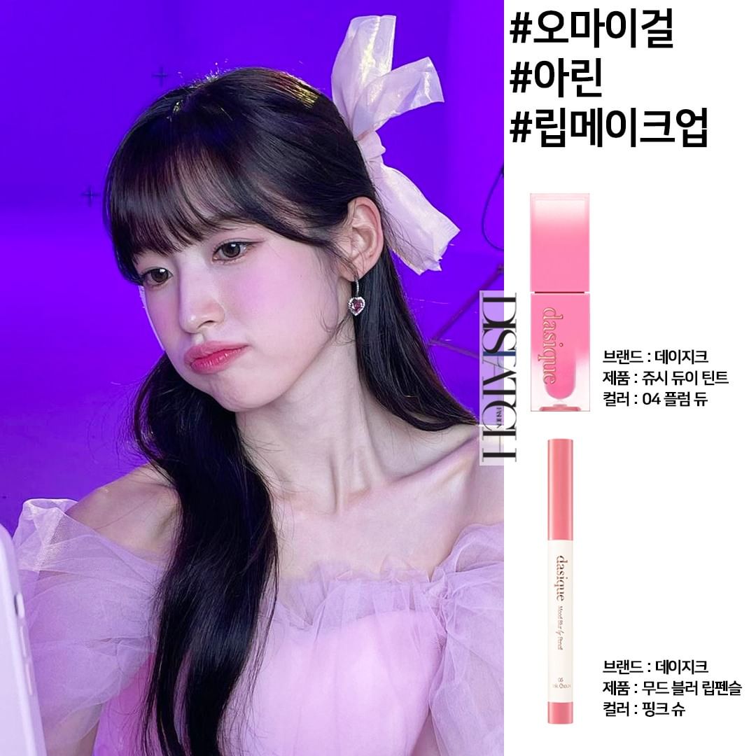 Arin (Oh My Girl) nổi tiếng với vẻ ngoài ngọt ngào như công chúa, bởi vậy cô luôn diện các makeup look tone hồng. Fan của cô nàng muốn trang điểm theo idol thì chắc chắn không thể bỏ lỡ combo son Dasique Juicy Dewy Tint (màu 04 Plum Dew) mix cùng son viền môi Dasique Mood Blur Lip Pencil (màu 05 Pink Choux) để có ngay "đôi môi thương hiệu" luôn hồng ửng như trái cherry của Arin nhé.
