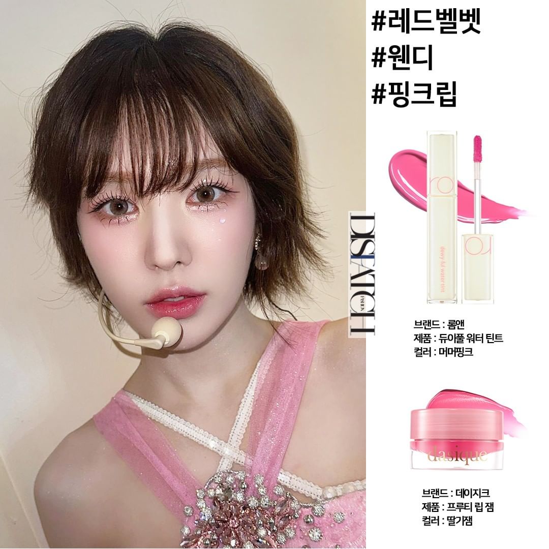 Những tín đồ mê mẩn phong cách trang điểm Hàn Quốc lấp lánh căng mọng, hãy tham khảo ngay layout này của Wendy. Đôi môi hồng ombre trong veo như thạch của Wendy chính là sự kết hợp của son Romand Dewyful Water Tint (màu Murmur Pink) và son dưỡng Dasique Fruity Lip Jam (màu Strawberry Jam).