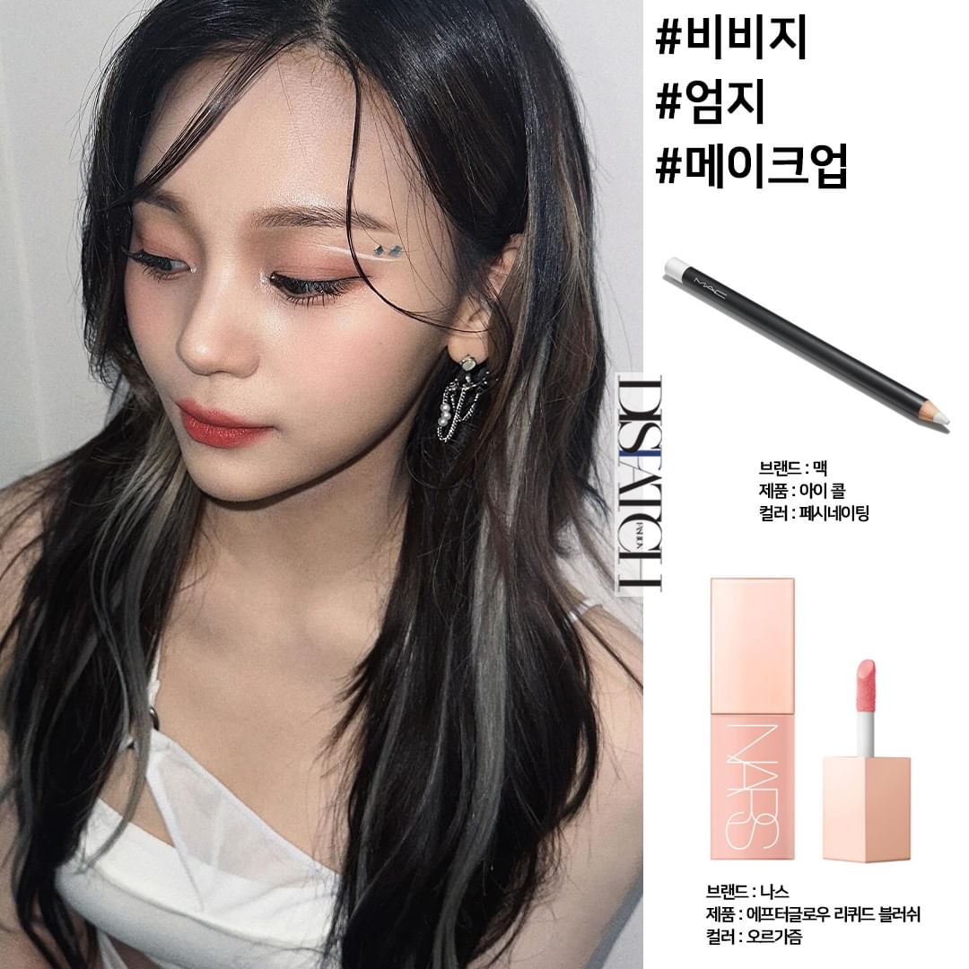 Từng được đặt biệt danh "nữ idol xấu nhất Kpop", Umji giờ đây lại khiến các bạn trẻ phát sốt với lối trang điểm sắc sảo, lôi cuốn. Makeup look hoàng hôn khiến Umji nhận cơn mưa lời khen này sử dụng phấn má hồng Nars Afterglow Liquid nhấn vào đôi má cam ửng hồng. Cô nàng tạo điểm nhấn với đường eyeliner trắng sắc mảnh được vẽ bằng bút kẻ Mac Cosmetics Eye Kohl Pencil Costa Riche.